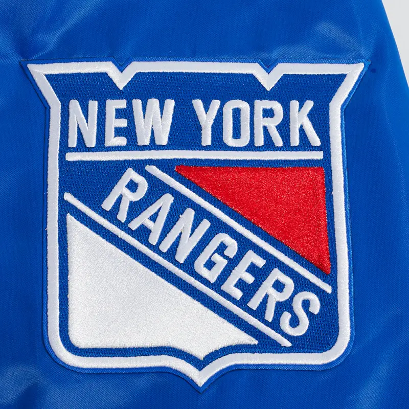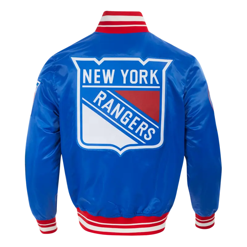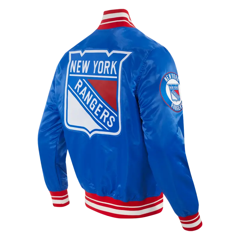NHL NEW YORK RANGERS SCRIPT TAIL MEN’S SATIN JACKET (ROYAL BLUE\/RED)